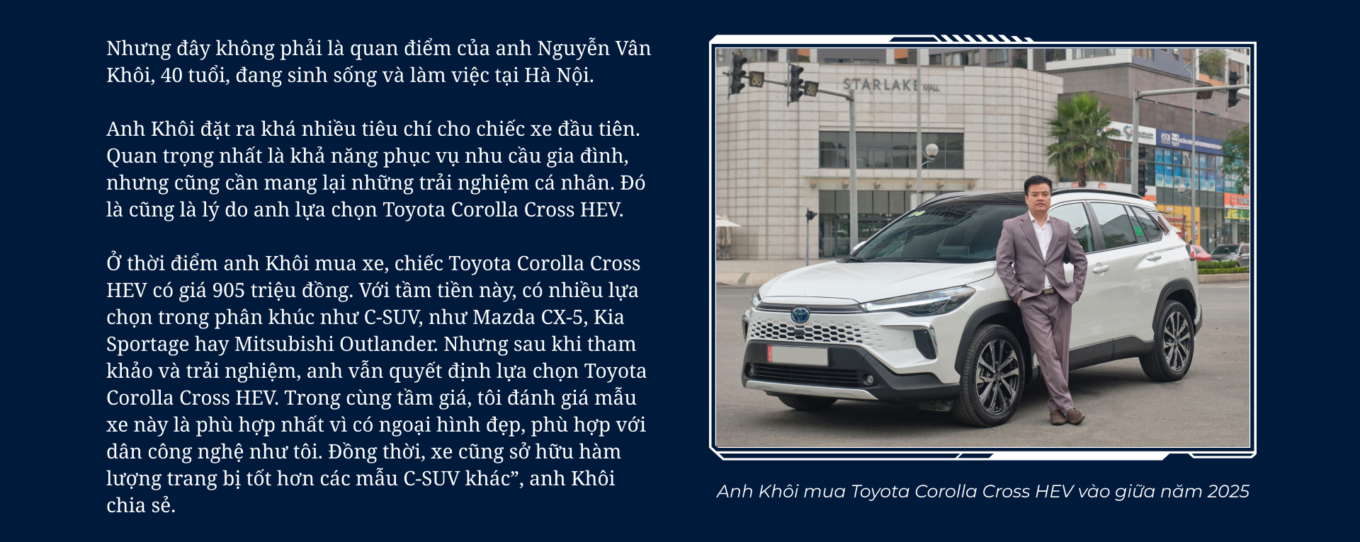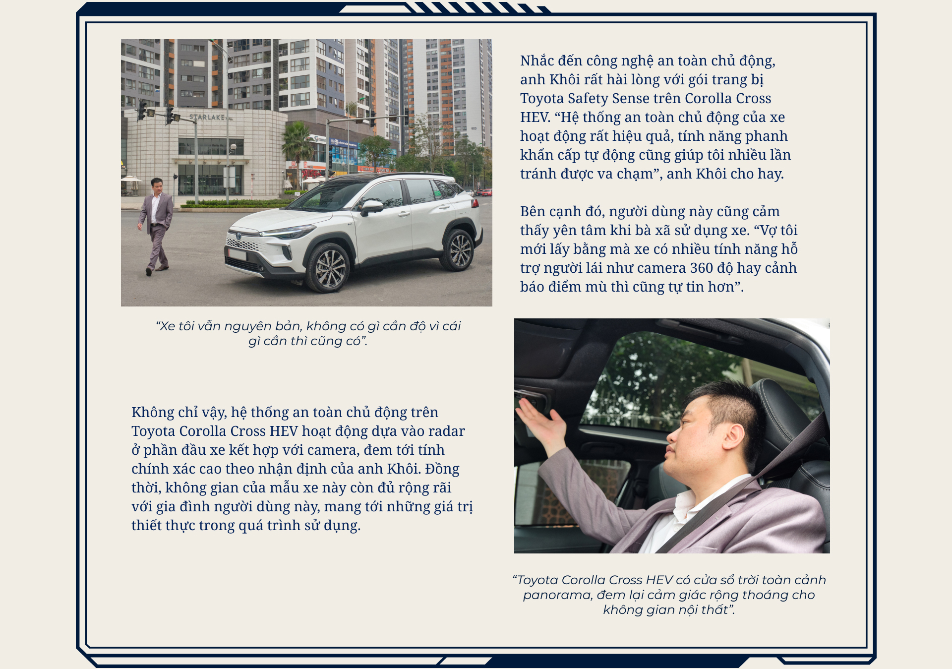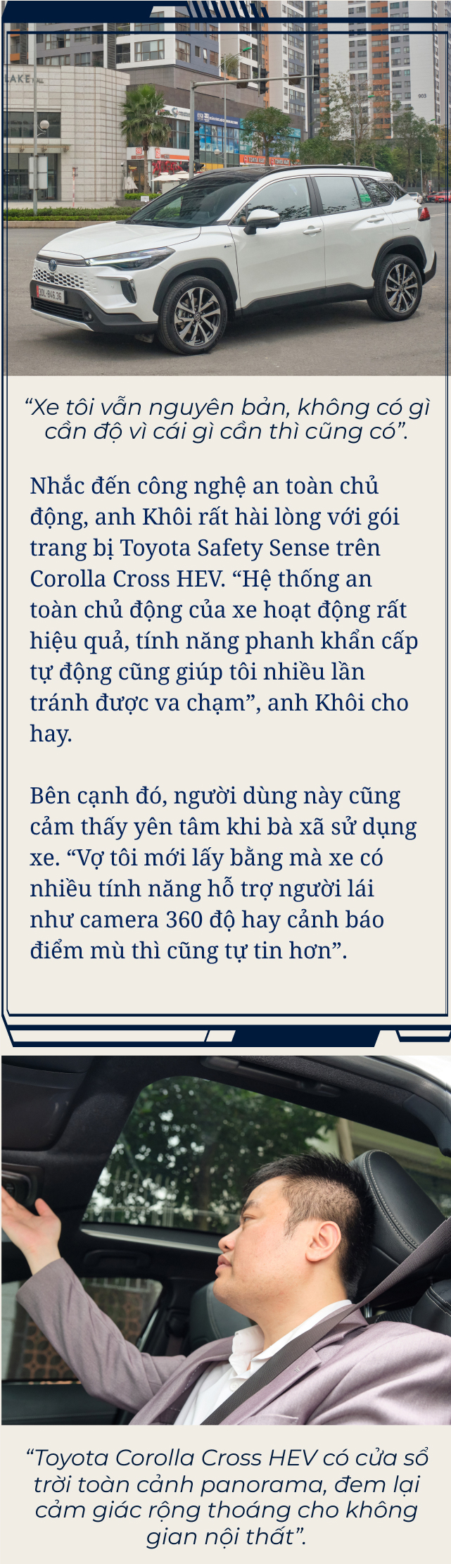 “Toyota là hãng xe uy tín, đã đặt nền móng hơn 30 năm phát triển tại Việt Nam, đã được “thử lửa” rất lâu rồi mới tồn tại được. Tôi thấy họ đã nghiên cứu rất kỹ thị trường rồi mới đem Toyota Corolla Cross HEV về, nên tôi hoàn toàn yên tâm khi lựa chọn mẫu xe này”, anh Khôi nhấn mạnh.
